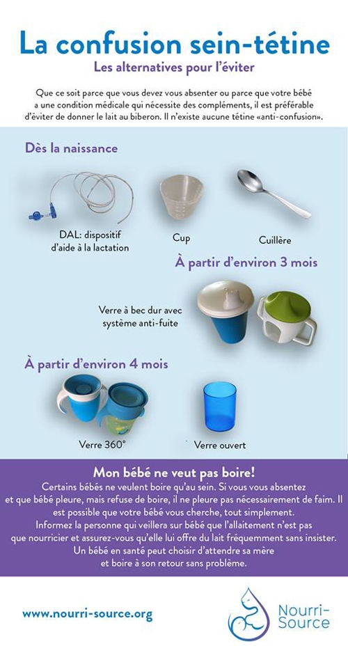 Que ce soit parce que vous devez vous absenter ou parce que votre bébé a une condition médicale qui nécessite des compléments, Il est préférable dé`viter de donner le lait au biberon. Il n'existe aucune tétine "anti-confusion"
